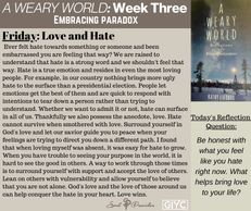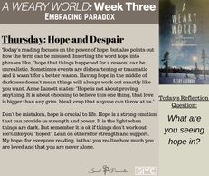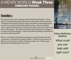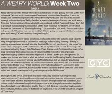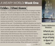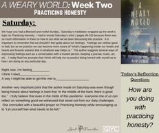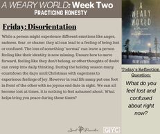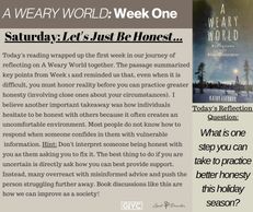Today's reading wrapped up the first week in our journey of reflecting on A Weary World together. The passage summarized key points from Week 1 and reminded us that, even when it is difficult, you must honor reality before you can practice greater honesty (involving close ones about your circumstances). I believe another important takeaway was how individuals hesitate to be honest with others because it often creates an uncomfortable environment. Most people do not know how to respond when someone confides in them with vulnerable information. Hint: Don't interpret someone being honest with you as them asking you to fix it. The best thing to do if you are uncertain is directly ask how you can best provide support. Instead, many overreact with misinformed advice and push the person struggling further away. Book discussions like this are how we can improve as a society!