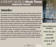 The topic for this week’s readings is titled “Embracing Paradox” which means “contradicting things existing in the same space at the same time.” Throughout this coming week the author will discuss embracing paradox and how it can help us during this holiday season. Always remember “there’s light in the darkness, beautiful in the ugly, peace in the chaos, and hope in the despair.” The author concludes the introduction by asking us to ponder this tough question, “What contradictory feelings or qualities do you notice within yourself?”