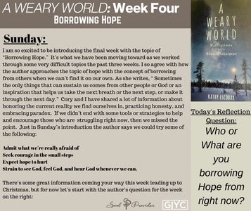 I am so excited to be introducing the final week with the topic of “Borrowing Hope.” It’s what we have been moving toward as we worked through some very difficult topics the past three weeks. I so agree with how the author approaches the topic of hope with the concept of borrowing from others when we can’t find it on our own. As she writes, “ Sometimes the only things that can sustain us comes from other people or God or an inspiration that helps us take the next breath or the next step, or make it through the next day.” Cory and I have shared a lot of information about honoring the current reality we find ourselves in, practicing honesty, and embracing paradox. If we didn’t end with some tools or strategies to help and encourage those who are struggling right now, then we missed the point. Just in Sunday’s introduction the author says we could try some of the following: